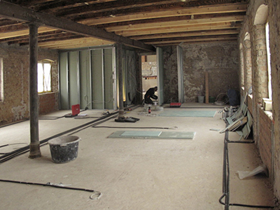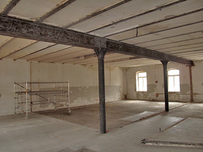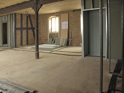 Trockenbau und Elektroinstallation im ersten Obergeschoss des Südflügels. Hier wird ein Künstleratelier entstehen.