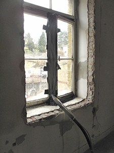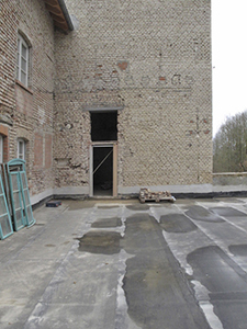 Entfernung des Wandputzes im Turm und erweiterte Türöffnung zur Terrasse über dem ehemaligen Getreidelager.