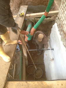 Im Grabenschacht an den hangseits gelegenen Grundmauern des Malzhauses wird Isolierputz gegen eindringende Feuchtigkeit aufgebracht.