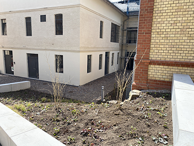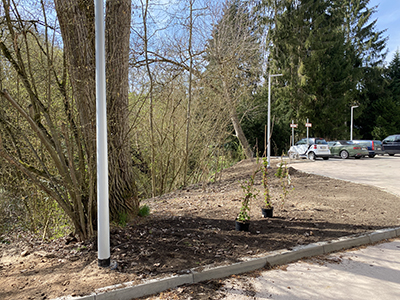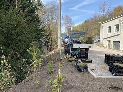 Die verbliebenen Grünflächen seitlich der Parkplätze auf der Südseite der Walkmühle werden mit Sträuchern und "Bodendeckern" bepflanzt.