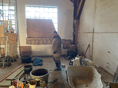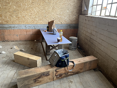 Links: Der noch verschlossene Durchgang zwischen großem Saal und Brauhaus. Rechts: Improvisierte Sitzecke für Pause der Trockenbauer. |