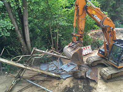 Mit Schweißbrenner und Bagger wird das alte Vordach an der Südseite des Kühlschiffes abgerissen und zerlegt.