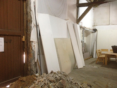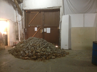 Schuttberg und zerlegte Präsentationswand im Ausstellungsraum des Kühlschiffes durch die Verlegung der neuen Wasser- und Heizungszuleitungen.