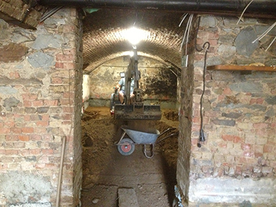 Sowohl mit Maschinenkraft als auch von Hand wird das Niveau des Fußbodens in den Gewölben abgegraben.