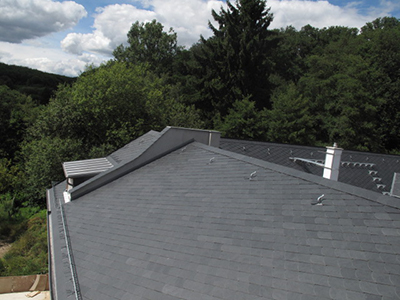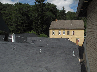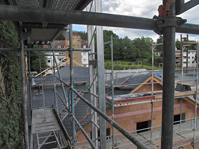 Aussicht auf die bereits fertiggestellten Schieferdächer von Mühlenhaus, Pferdestall und Südflügel.