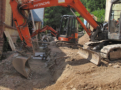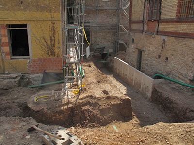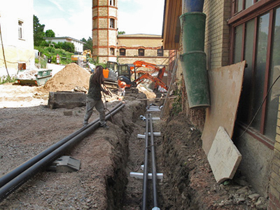 Arbeiten an den Versorgungsgräben rund um Mühlenhaus, Mühlenhof und Malzhaus.