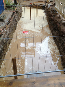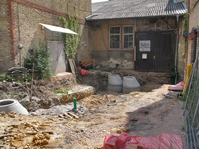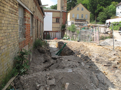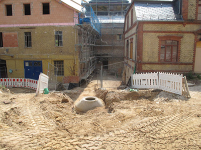 Tiefbauarbeiten für die Kanalisation am Maschinenhaus, Kühlschiff und zwischen Sud-, Malz- und Mühlenhaus.