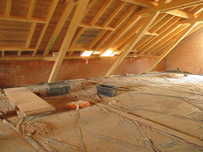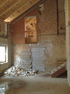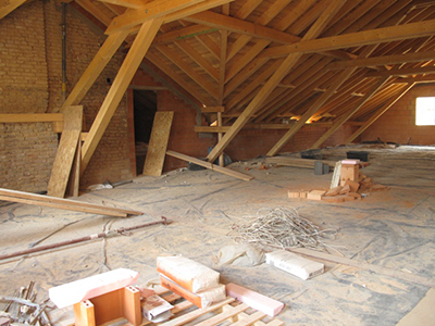 Letzte Arbeiten am Dachstuhl des Malzhauses: Aufmauern der Wandanschlüsse zum Dach.
