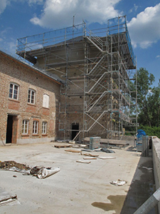 Südseite der Walkmühle mit eingerüstetem Turm und Malzhaus.