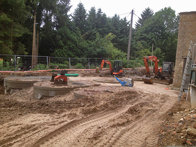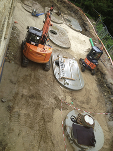 Auf der Südseite der Walkmühle sind die ersten Betonzisternen mit jeweils 25000 Liter Fassungsvermögen gesetzt. In ihnen wird Regenwasser aufgefangen, das schließlich als Löschwasserbevorratung im Brandfall dienen soll.