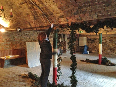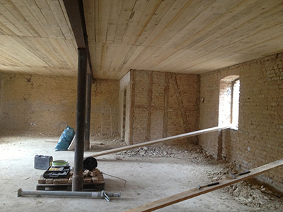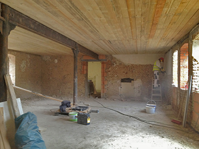 Der alte Putz an den Wänden im Erdgeschoss des Südflügels wird entfernt. Gut zu erkennen auch die neue Decke.
