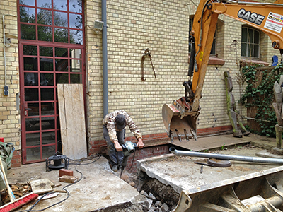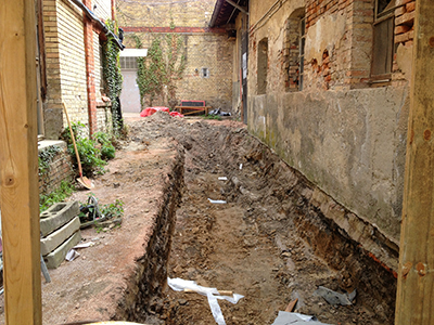 Die ersten Gräben für die Versorgungsleitungen direkt am Gebäude werden gezogen: