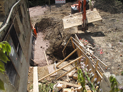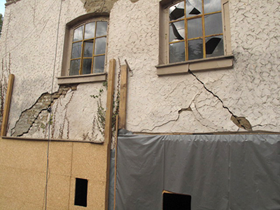 Grabungen rund um das Getreidelager und sichtbare Setzungsrisse an der Fassade.