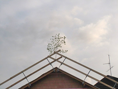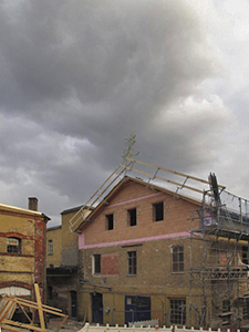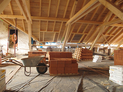 Während die Beplankung des neuen Dachstuhls bereits fast fertig ist, wird der Giebel zur Südseite noch aufgemauert.