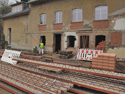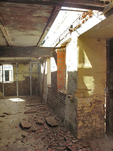 Malzhaus Erdgeschoss: Abbruch der Wand zwischen ehemaligem Ausstellungsraum und Treppenhausflur. |
