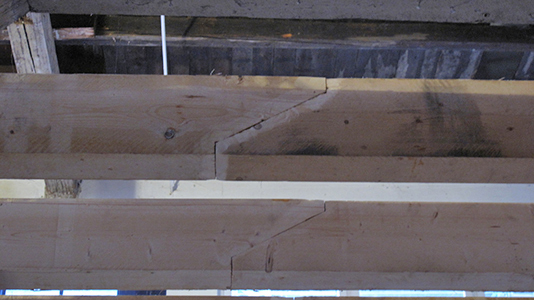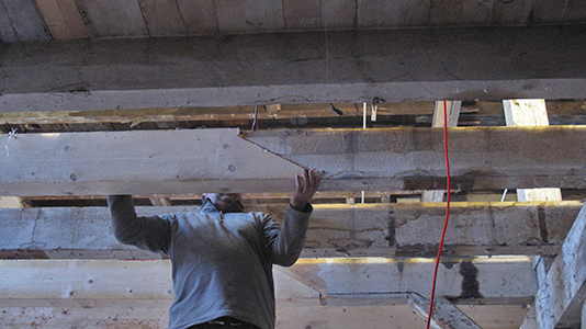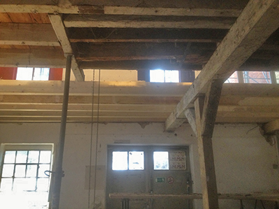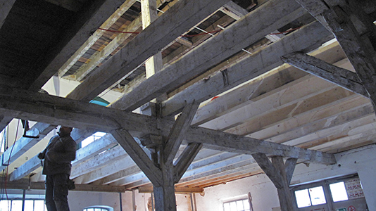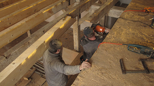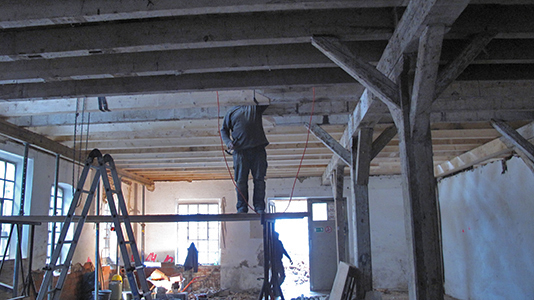Feinste Zimmermannsarbeit: Erneuerung eines Großteils der Deckenbalken zwischen Erdgeschoss und Obergeschoss des Malzhauses.