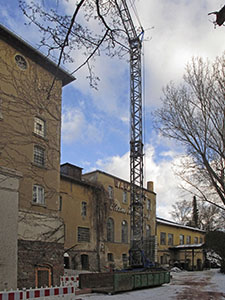 17.01.2017 Der Kran ist aufgebaut. Benötigt wird er für den Materialtransport bei der vollständigen Erneuerung des Malzhaus-Daches und für den Südflügel bzw. Turm. |