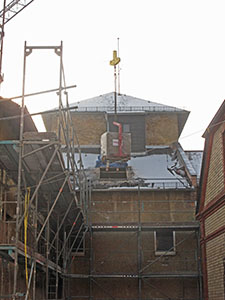 Durch eine extra in der Dachfläche geschaffenen Öffnung werden mit dem Kran Materialien in das Dachgeschoss des Südflügels transportiert. |