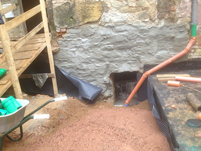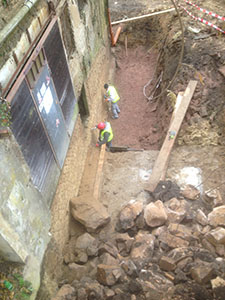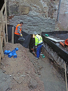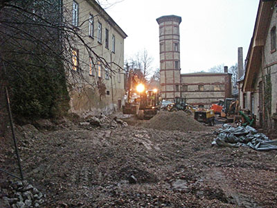 Die Fundamente des Malzhauses und Südflügels werden ausgebessert und gegen Feuchtigkeit geschützt.