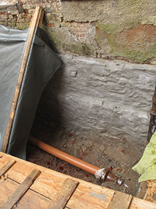 Der alte Brunnenschacht am Mühlhof wird auf das spätere Niveau aufgemauert.