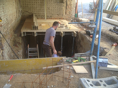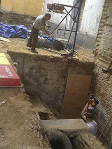 Innenhof vor dem Brauhaus: Verschalungs- und Armierungsarbeiten für die neu zu gießende Decke bzw. Bodenplatte über dem Keller des Brauhauses.