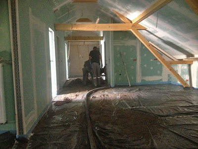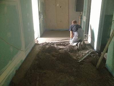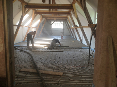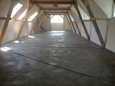 Der Estrich im künftigen Gemeinschaftsatelier im Dachgeschoss des Pferdestalles wird gegossen und bedeckt die Heizschleifen der Fußbodenheizung.