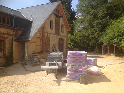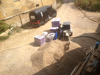 Zubereitung des Fußboden-Estrichs vor dem Pferdestall. Von hier aus wird der vorbereitete Estrich in das Dachgeschoss des Pferdestalles und des Südflügels (unten) gepumpt.