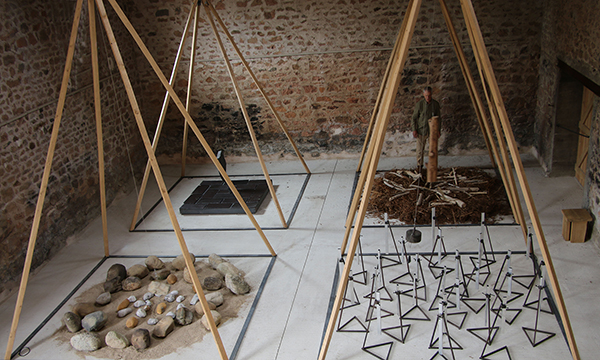 Will Menter ist nicht zum ersten Mal in der Walkmühle zu Gast: Bereits 2012 realisierte er zur Themenausstellung Klang eine große Klanginstallation aus hängenden und im Wind schwingenden Holzbrettern im Außenbereich und realisierte in diesem Kontext auch seine Performances Drips of Wood und Life Forms in der Walkmühle. Seine nun in der Ausstellung gezeigte Klangskulptur Inhabitation besteht aus vier fünf Meter hohen pyramidenförmigen Konstruktionen aus Eichenholz, die zusammen ein Pendelorchester bilden. An der Spitze jeder Pyramide ist ein Draht befestigt, an dessen Ende ein Gewicht hängt, das auf vier verschiedene Materialien auf dem Boden schlägt. Das Werk ist als Dauerperformance konzipiert, die vom Künstler Will Menter aktiviert wird. Sie erforscht eine sich ständig verändernde Musik, die durch das Zusammenspiel mit unterschiedlich stark bearbeiteter Materie entsteht: von Flusssteinen und Treibholz bis hin zu präzise gestimmten Aluminiumrohren.